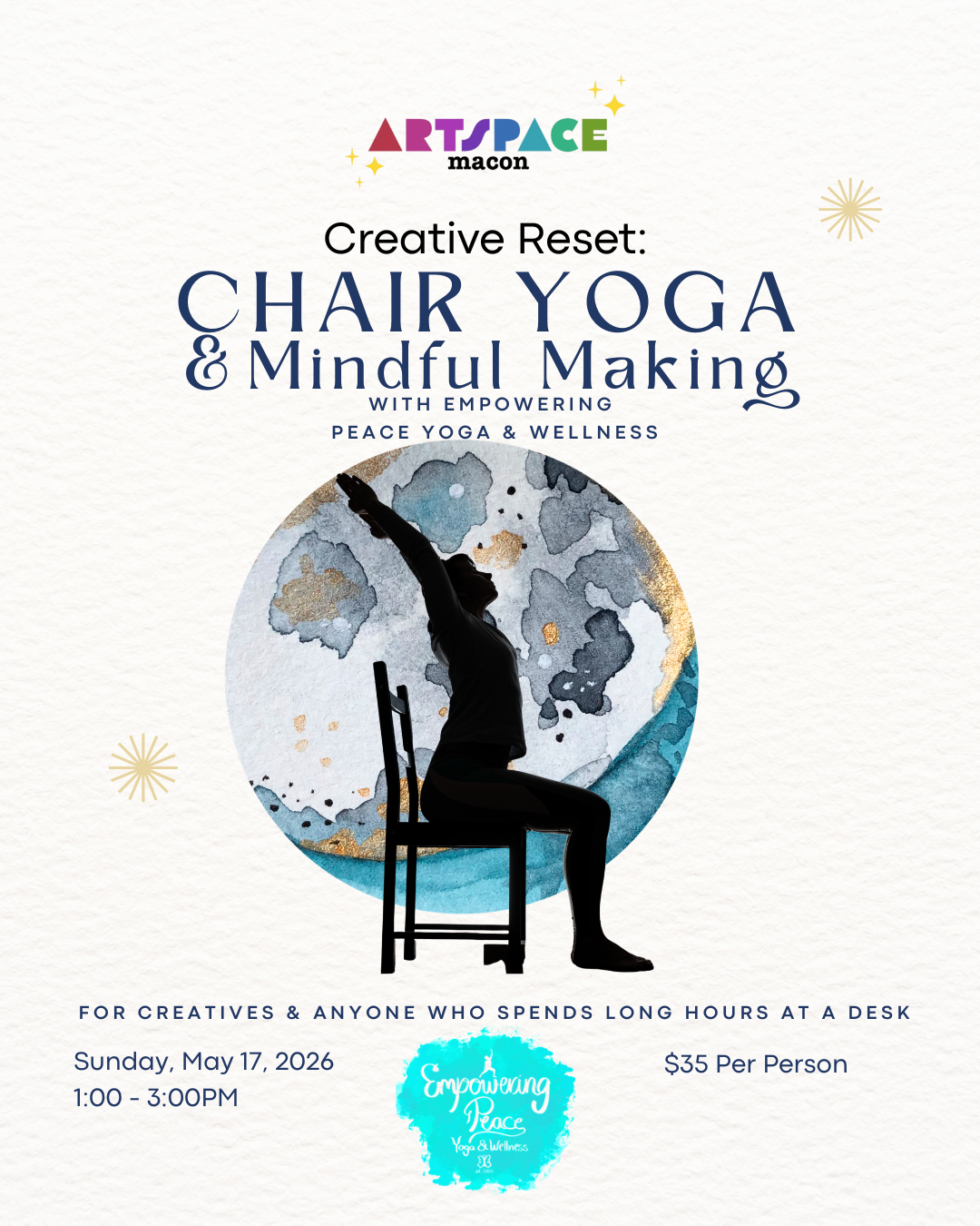 We’ll begin with chair yoga to release tension in the neck, shoulders, back, and wrists, followed by a simple mindful creative exercise to help you slow down and reset.
